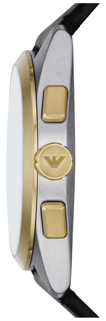 The Emporio Armani AR11498 watch combines a 43mm round shaped stainless steel case and black leather strap with a traditional buckle. It has a white analogue dial with date display, chronograph sub-dials, a tachymeter scale which is protected beneath mineral crystal glass. Power is generated by the quartz movement. This model also has a water resistance of up to 50 metres.