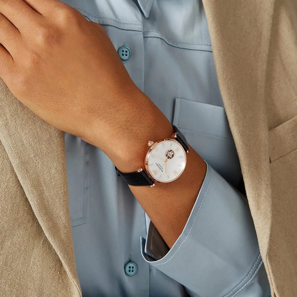 Emporio Armani's 34mm watch features a rose gold-toned stainless steel case, glossy white mother of pearl dial, automatic movement and black leather strap.