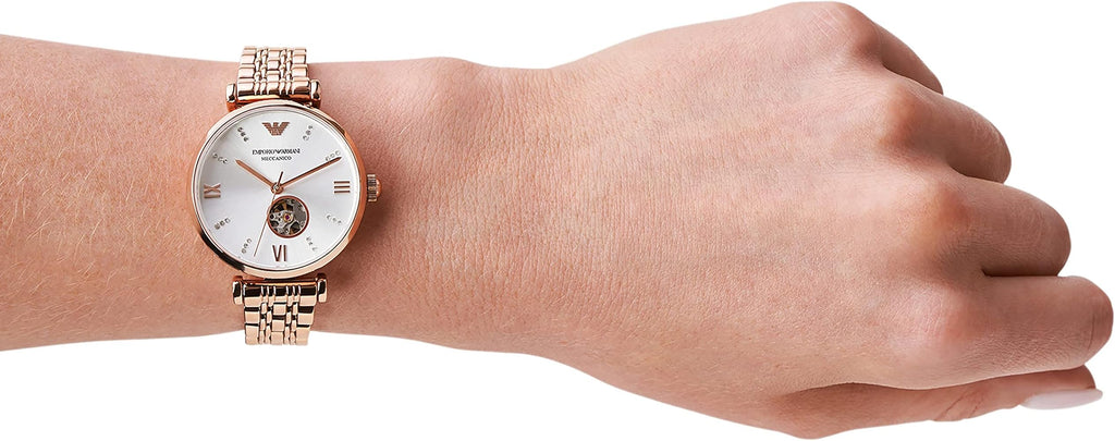 Up the glam factor with Gianni T-Bar's collection from the House of Emporio Armani as it takes it a notch up. This impeccable timepiece fashioned with a glitz-outlined bezel features three-hand movement with a skeleton sub-dial and rose-gold 7-link bracelet to finish the look. This rose-gold automatic watch is surely going to leave you in awe with its design and performance.
