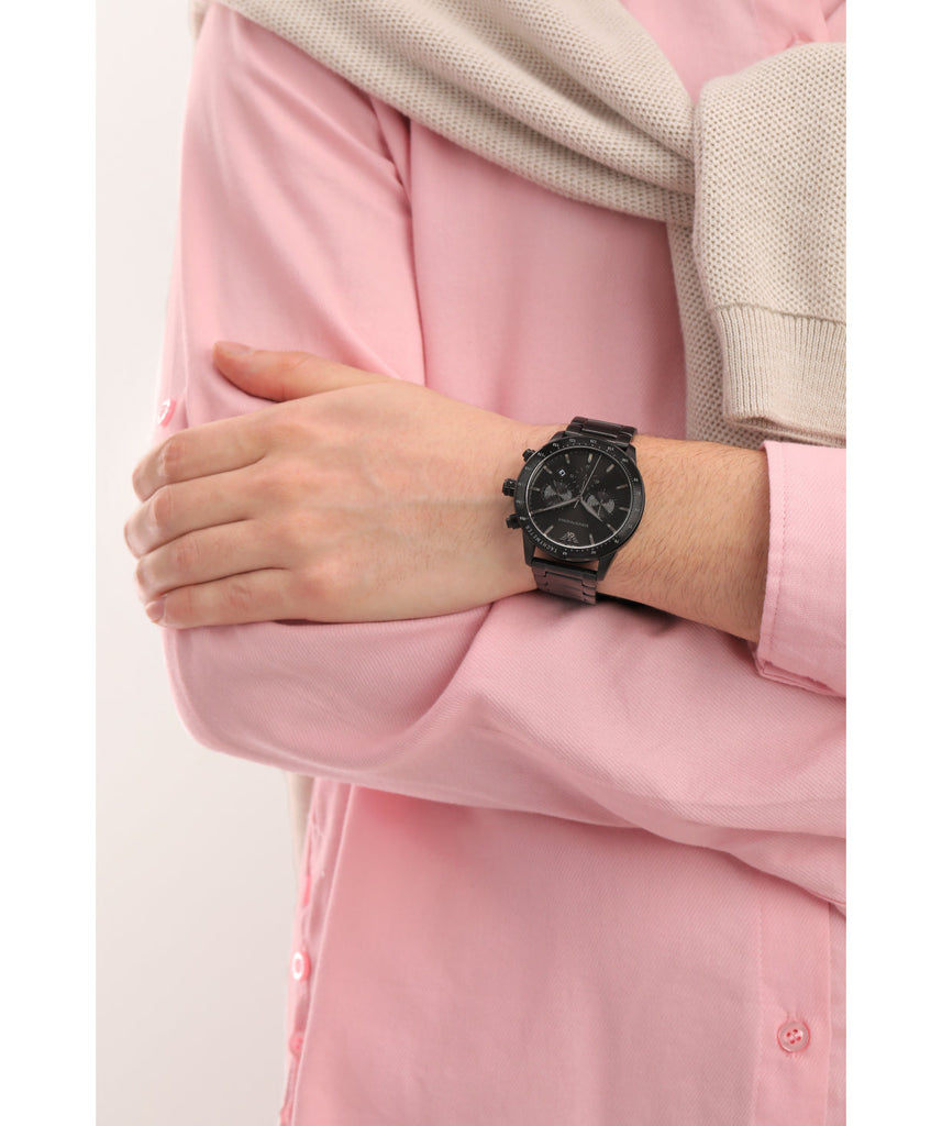 This 43mm watch features a black dial with gunmetal stick indexes, chronograph movement and black stainless steel bracelet.