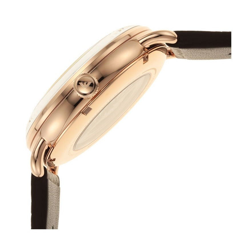 Emporio Armani Men's Automatic Brown Leather Timepiece - This 43mm watch features a white skeleton dial with rose gold-tone stick indexes, automatic movement, and a brown genuine leather strap. Composition 70% Stainless Steel, 15% Leather, 12% Crystal, 3% Plastic. This stylish and handsome timepiece is sure to complete any man's collection.