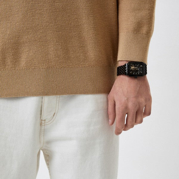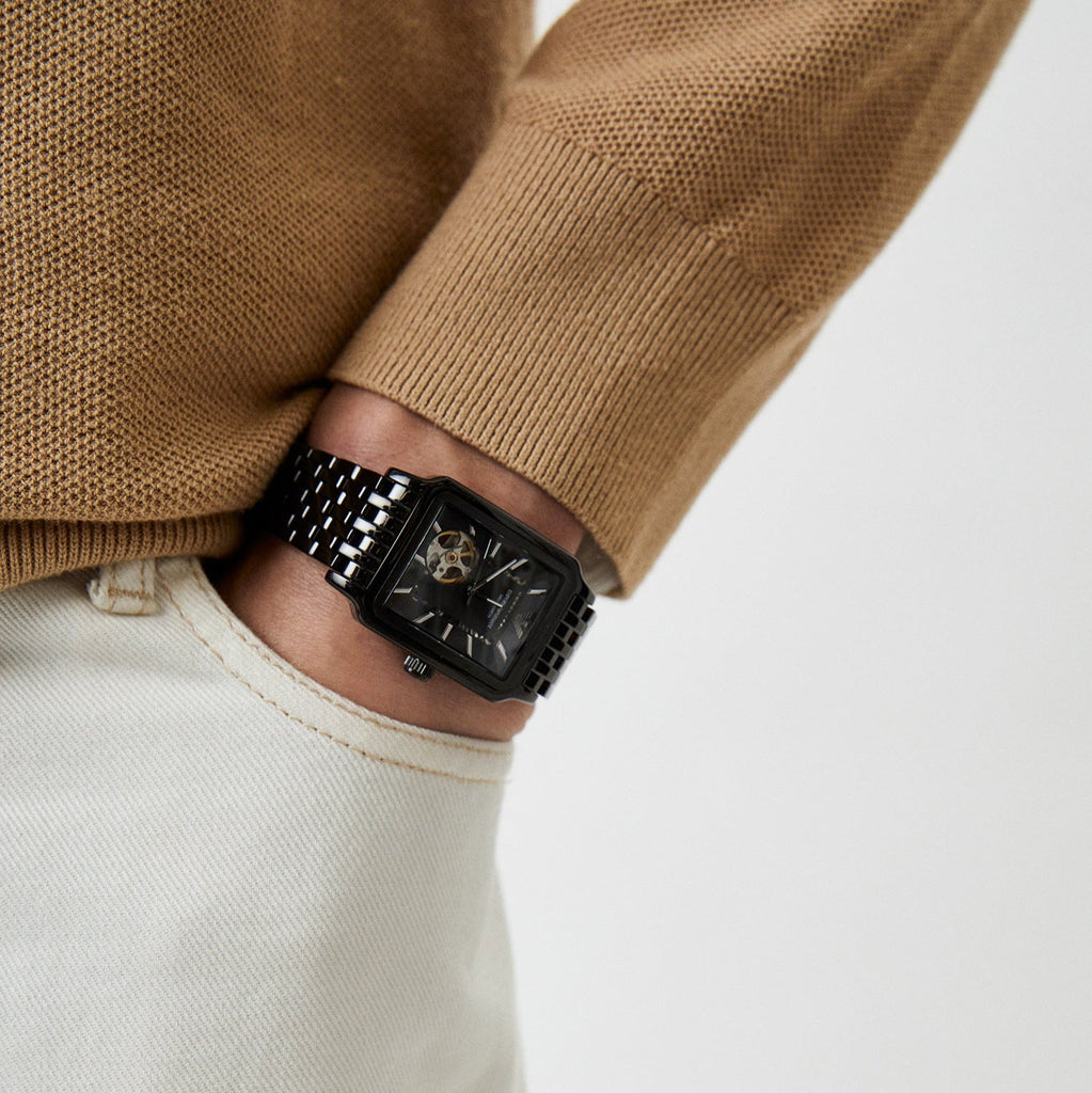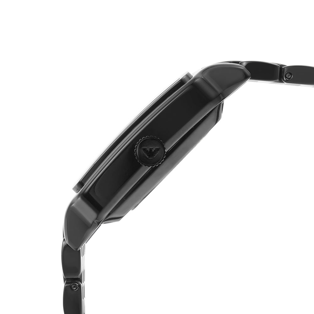 Emporio Armani's 32x38mm watch features a black sunray textured dial, stainless steel case, automatic movement and black stainless steel bracelet.