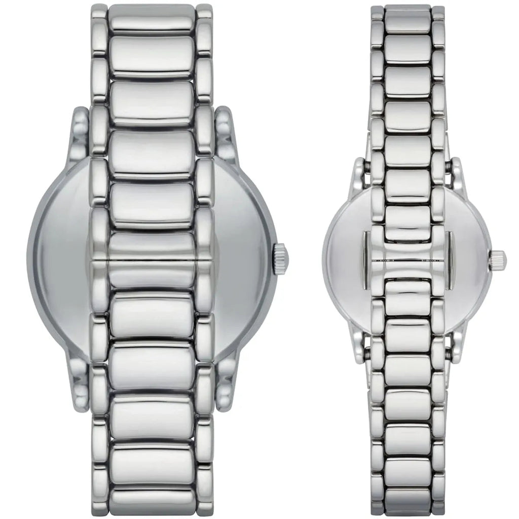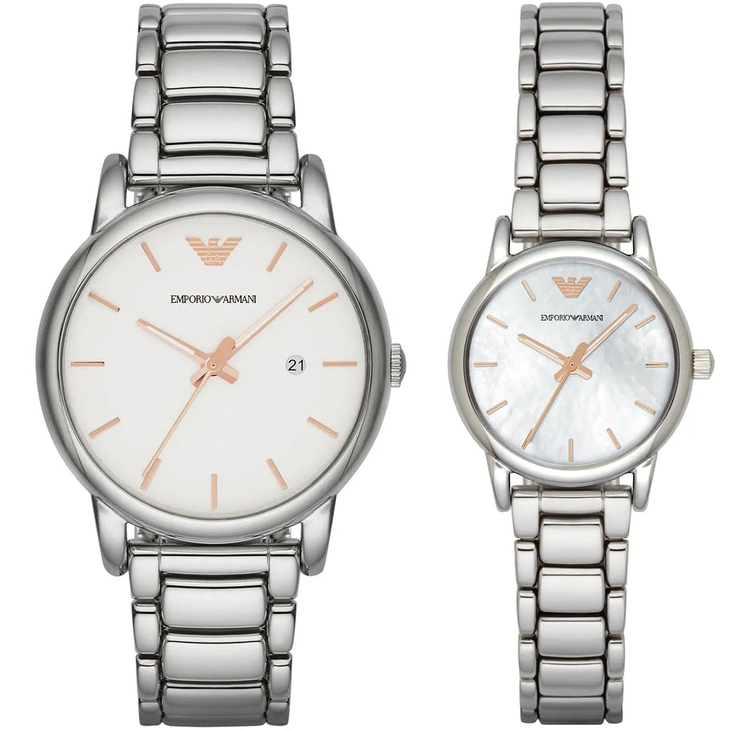 Silver-tone stainless steel case and bracelet. Fixed silver-tone stainless steel bezel. White dial with rose gold-tone hands and index hour markers. Dial Type: Analog. Luminescent hands. Date display at the 3 o'clock position (on Men's watch). Quartz movement. Scratch resistant mineral crystal. Pull / push crown. Solid case back. Round case shape, case size: 41 mm. Water resistant at 30 meters / 100 feet. Functions: date, hour, minute, second. Dress watch style. Emporio Armani Quartz White Dial Mens AR90000.