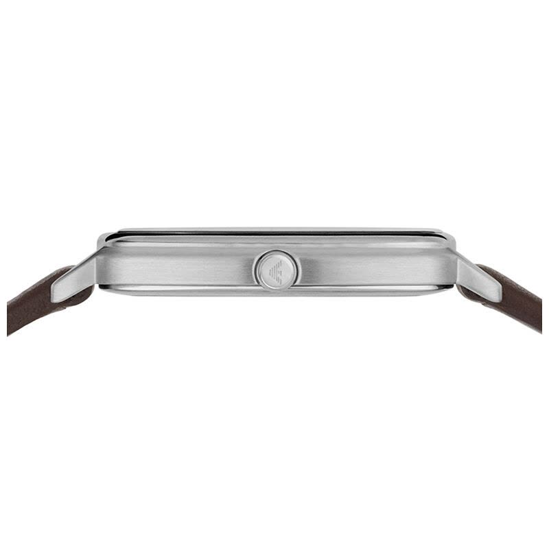 Stainless steel case with a brown leather strap. Fixed stainless steel bezel. Blue sunray dial with silver-tone hands and index hour markers. Arabic numerals mark the 3, 6 and 9 o'clock positions. Minute markers around the outer rim. The Emporio Armani logo appears at the 12 o'clock position. Dial Type: Analog.