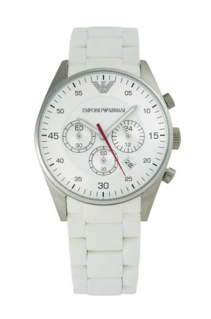 Sport and fashion come together in this sophisticated watch by Emporio Armani The silver tone dial is accented by chronograph movement A white silicone strap completes the look