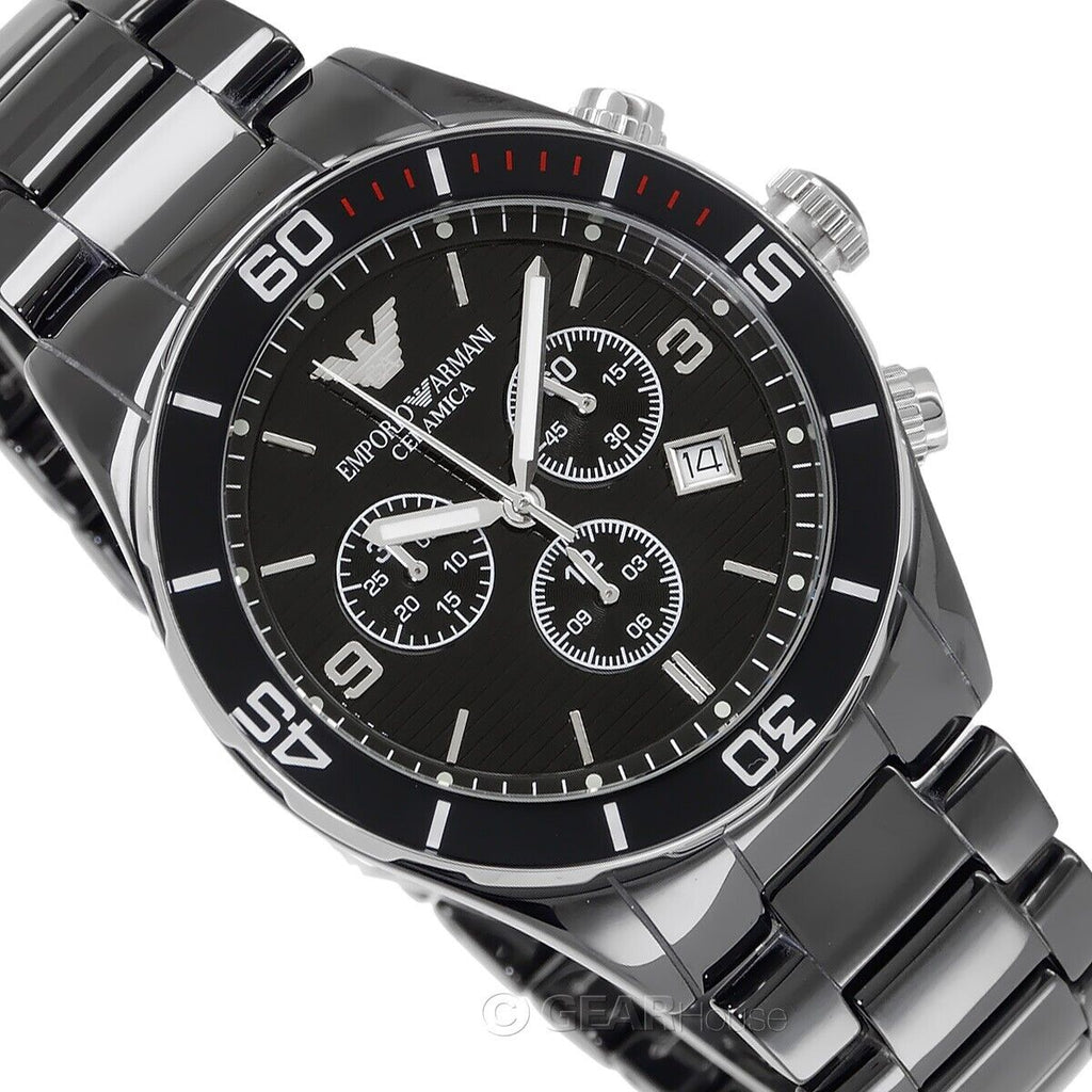 Black ceramic case with a black ceramic bracelet. Black ceramic bezel. Black dial with luminous hands and index hour markers. Arabic numerals mark the 3 and 9 o'clock position.Minute markers. The Emprio Eagle appears at the 12 o'clock position. Luminescent hands. Date display appears at the 4 o'clock position. Chronograph - three sub-dials displaying: 60 seconds, 30 minutes and 12 hours. Quartz movement. Scratch resistant mineral crystal. Solid case back. Case diameter: 43 mm. Deployment clasp. Water resistant at 50 meters / 165 feet. Functions: hours, minutes, seconds, calendar, chronograph. Emporio Armani Black Ceramic Chronograph Men's Watch AR1421.