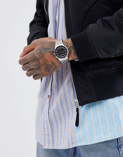 This Emporio Armani Sportivo Black Dial Stainless Steel Men's Watch AR2457 comes in stainless steel case with a stainless steel bracelet. Fixed stainless steel bezel. Black dial with silver-tone hands and index hour markers. The Emporio Armani logo appears at 12 o'clock. Minute markers around the outer rim. Dial Type: Analog. Date display at the 6 o'clock position. Quartz movement. Scratch resistant mineral crystal. Pull / push crown. Solid case back. Case diameter: 43 mm. Case thickness: 9 mm. Round case shape. Band width: 22 mm. Band length: 8 inches. Fold over clasp with a push button release. Water resistant at 50 meters / 165 feet. Functions: date, hour, minute, second. Casual watch style.