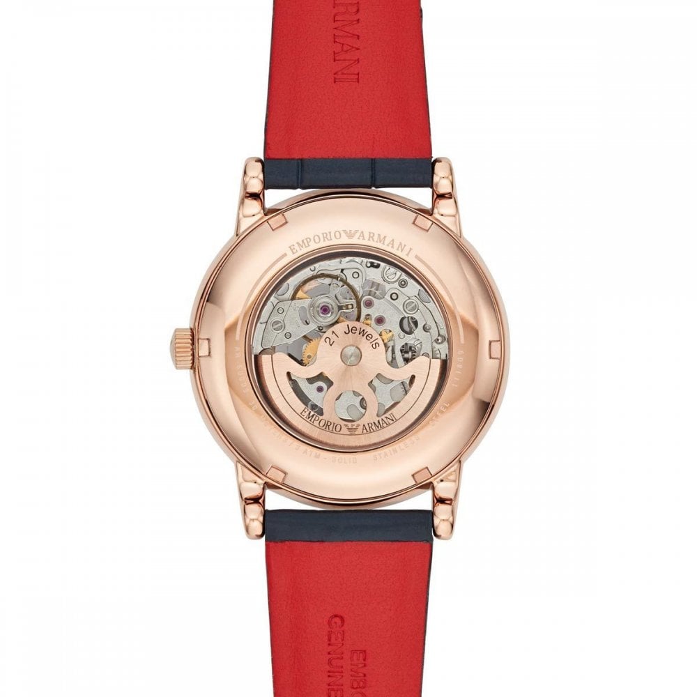 Rose gold-tone stainless steel case with a blue leather strap. Fixed rose gold-tone bezel. White (skeleton centered) dial with luminous rose gold-tone hands and index hour markers. Minute markers around the outer rim. The Emporio Armani eagle appears at the 12 o'clock position. Dial Type: Analog. Luminescent hands. Automatic movement. Scratch resistant mineral crystal. Pull / push crown. Transparent case back. Round case shape. Case size: 43 mm. Case thickness: 13 mm. Band width: 22 mm. Tang clasp. Water resistant at 30 meters / 100 feet. Functions: hour, minute, second. Casual watch style. Emporio Armani Skeleton Automatic White Dial Watch AR60009.