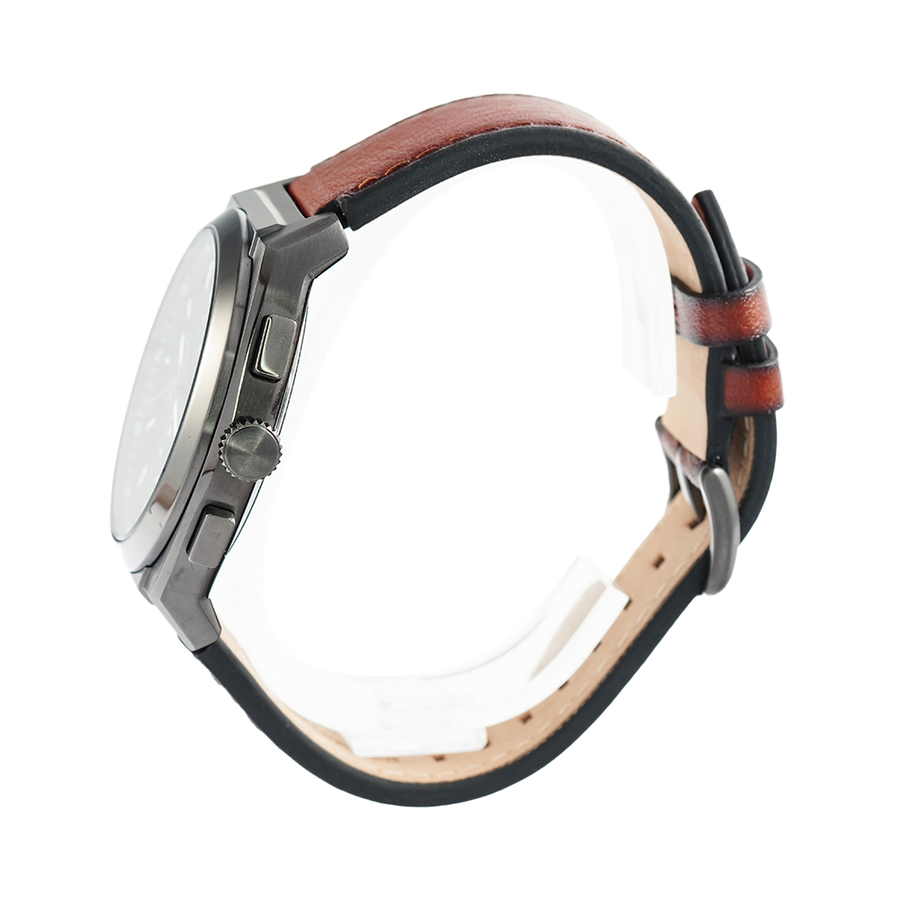 Gunmetal-plated stainless steel case with a brown leather strap. Fixed gunmetal-plated bezel. Grey dial with luminous grey hands and index hour markers. Arabic numeral minute markers (at 5 minute intervals). Minute markers around the outer rim. Dial Type: Analog. Luminescent hands and markers. Date display at the 3 o'clock position. Chronograph - three sub-dials displaying: 60 second, 30 minute and 1/10th of a second. Quartz movement.