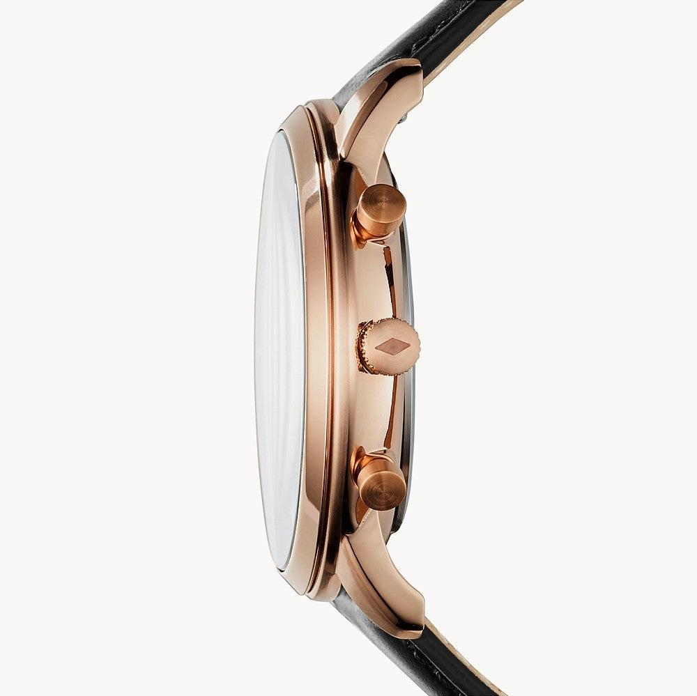 Rose gold-tone stainless steel case with a black leather strap. Fixed rose gold-tone bezel. Black dial with luminous rose gold-tone hands and index hour markers. Roman numerals mark the 6 and 12 o’clock positions. Minute markers around the outer rim.