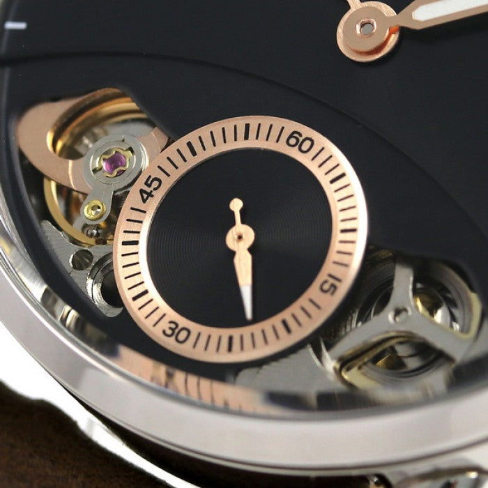 Stainless steel case with a brown leather strap. Fixed stainless steel bezel. Black (skeletal display) dial with luminous rose gold-tone hands and index hour markers. Arabic numeral appears at the 12 o'clock positions. Minute markers around the outer rim. Dial Type: Analog. Luminescent hands and markers.