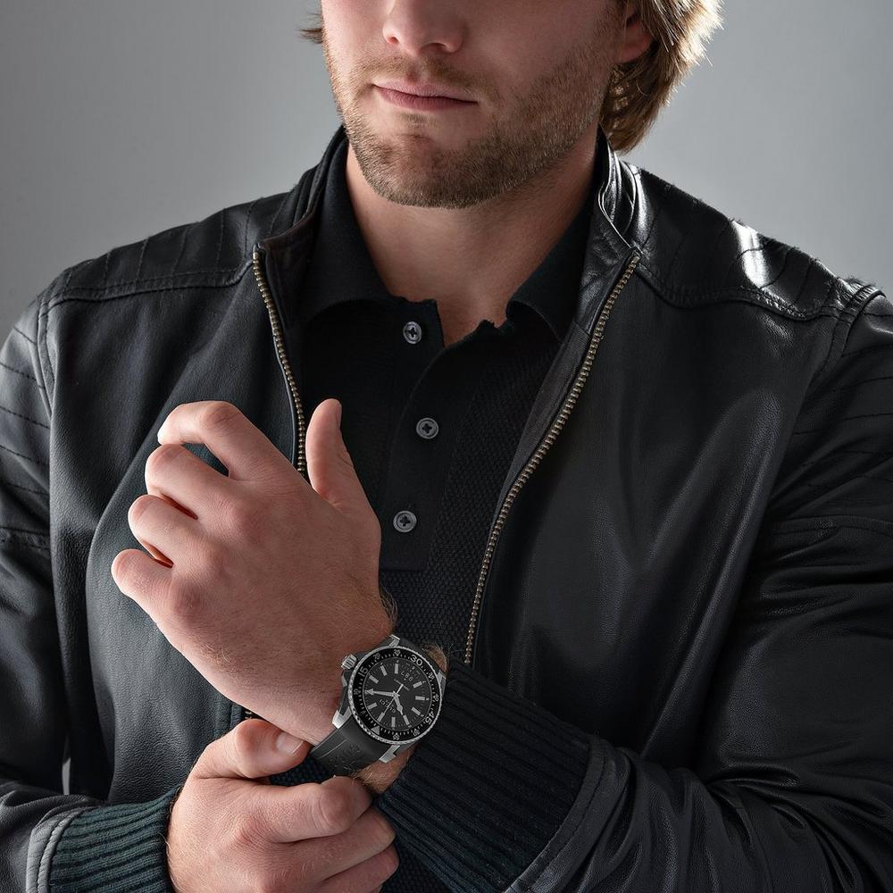 Gucci Dive Men;s Watch has a Stainless steel case with a black rubber strap. Uni-directional rotating stainless steel bezel with a black PVD top ring. Black dial with silver-tone hands and index / Arabi numeral hour markers.