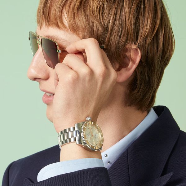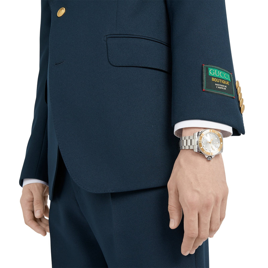 Silver-tone ‘Gucci Dive’ automatic watch from Gucci. This model features a stainless steel bracelet and 18k gold plated 40mm case, a dial with the brand's signature bee and logo as well as sapphire glass with antireflective coating.