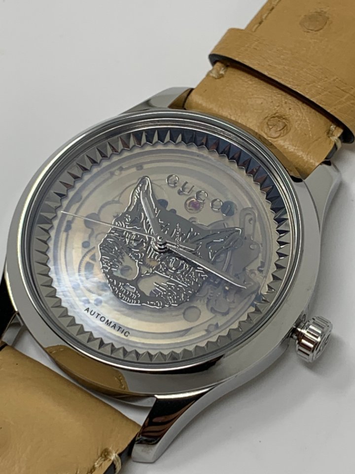 Transparent Mother of Pearl (Tiger Head) dial enhanced by silver-tone hands. Silver-tone stainless steel case with a wheat (ostrich) leather band. Automatic movement. 50 meters / 165 feet water resistance. Fixed bezel. Scratch Resistant Sapphire crystal. Transparent caseback. Tang clasp. Pull / Push crown. Case size 38 mm x 8 mm. Band 20 mm x long. Gucci YA1264112 G-Timeless Watch.