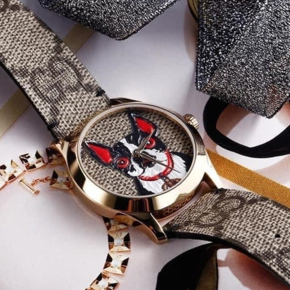 Beige Canvas Dial with Dog and Gucci Branding. Gold Plated Stainless Steel Hands.