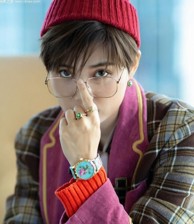 Yellow gold PVD stainless steel case with a aqua (flower print) leather strap. Fixed yellow gold PVD bezel. Aqua (flowers) dial with yellow gold-tone hands. No markers. Dial Type: Analog. Quartz movement. Scratch resistant sapphire crystal. Pull / push crown. Solid case back. Round case shape.