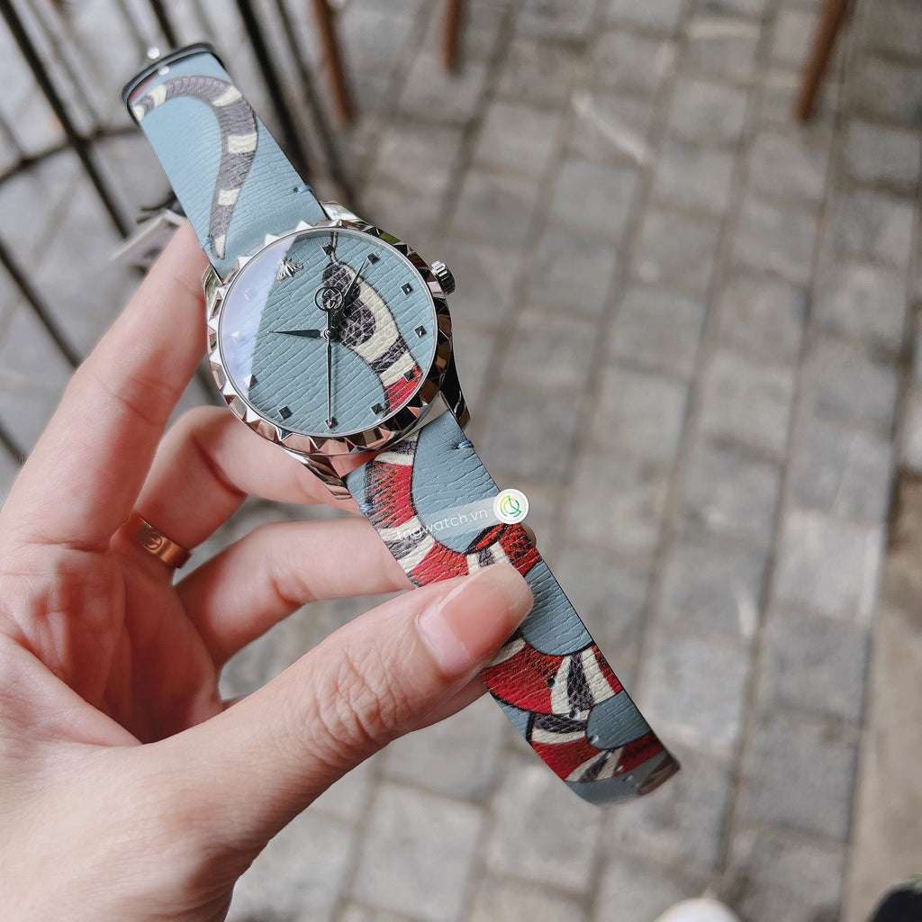 With this Gucci YA1264080 watch you will always be the center of attention. The body is made of durable stainless alloy. The quartz mechanism is super accurate in time readings. The dial is blue, it features a royal snake, and the design flows onto the strap. Leather strap, also blue. The dimensions of the watch are 38x8mm. Water resistance is 50m. This watch will become not only a beautiful accessory for you, but also a functional chronograph.