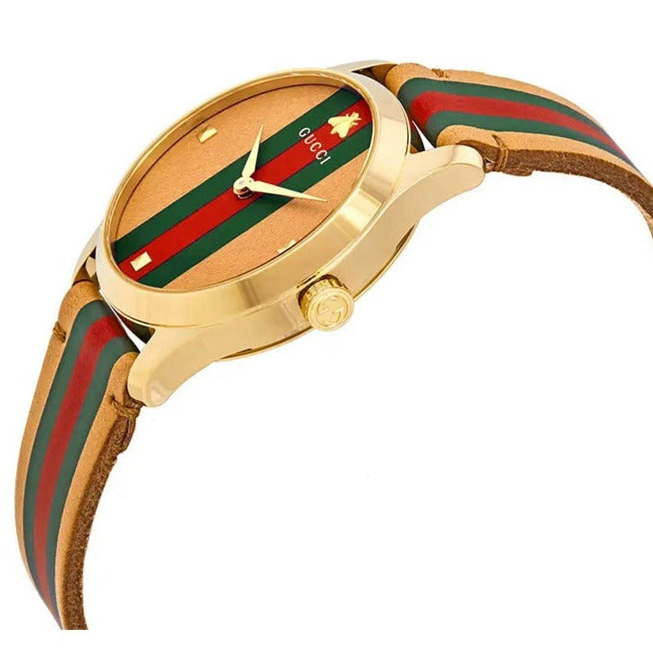 Yellow gold PVD stainless steel case with a brown (stiped) leather strap. Fixed yellow gold PVD bezel. Brown (stripe motif) dial with yellow gold-tone alpha-style shape hands. Pyramid markers at the 3, 6 and 9 o'clock positions. Dial Type: Analog. Quartz movement.Scratch resistant sapphire crystal. Pull / push crown. Solid case back. Round case shape. Case size: 38 mm. Case thickness: 9 mm. Band width: 19 mm. Tang clasp. Water resistant at 50 meters / 165 feet. Functions: hour, minute. G-timeless Series. Dress watch style. Watch label: Swiss Made. Gucci G-Timeless Brown Dial with Stripe Motif Striped Leather Watch YA1264077.