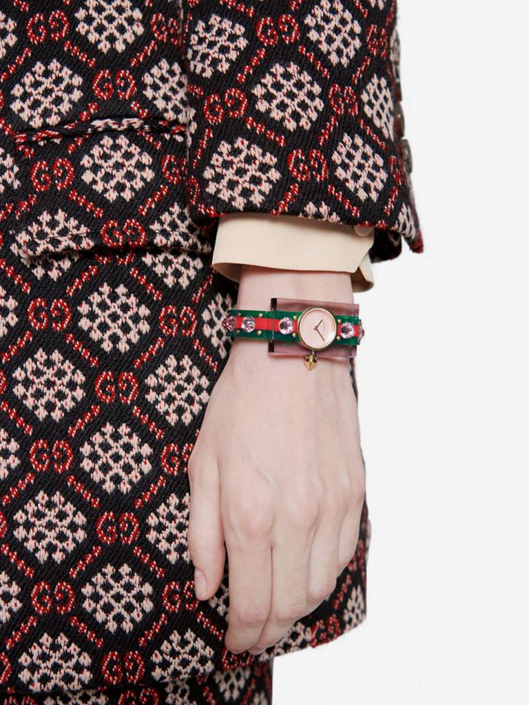 Transparent resin case with a green and red striped resin bracelet with pink crystal studs. Fixed gold-tone stainless steel bezel. Pink mother of pearl dial with gold-tone hands. No markers. Dial Type: Analog. Quartz movement. Scratch resistant sapphire crystal. Pull / push crown. Solid case back. Round case shape. Case dimensions: 24 mm x 40 mm. Case thickness: 8 mm. Band width: 11 mm. Water resistant at 30 meters / 100 feet. Functions: hour, minute. Vintage Web Series. Dress watch style. Watch label: Swiss Made. Gucci Vintage Web Pink Mother of Pearl Dial Ladies Watch YA143525.
