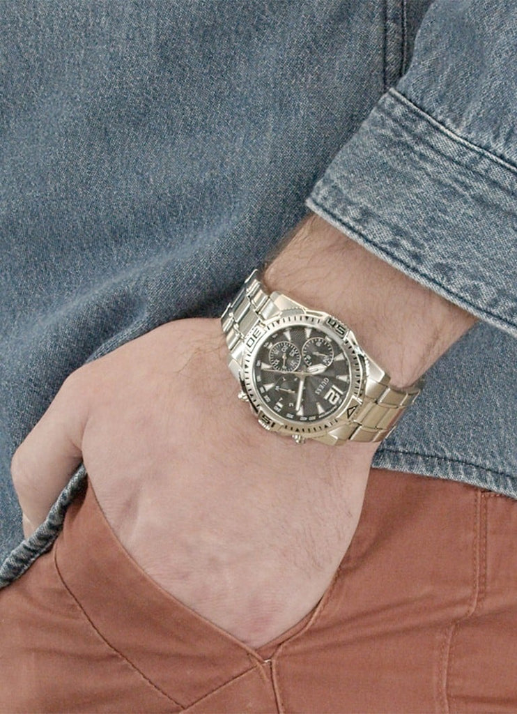 This model the GW0056G1 is a beautiful watch from Guess with a Quartz timepiece. The time is displayed Analog. In addition, this watch features a Mineral watch-glass. The watch is 5 bar waterproof, and with a Strap of Stainless Steel in the color Silver.