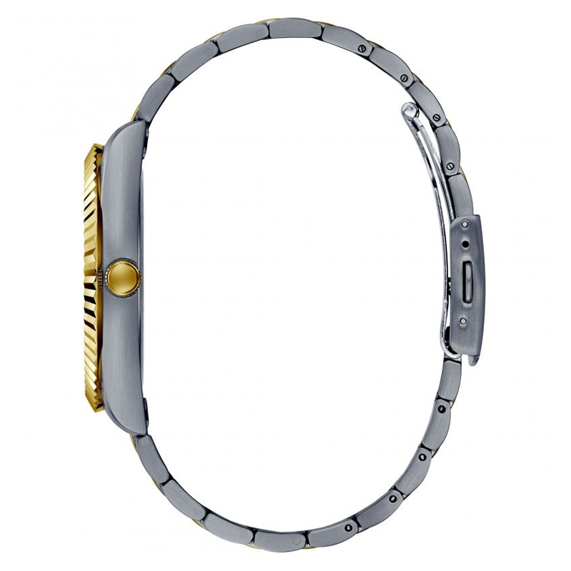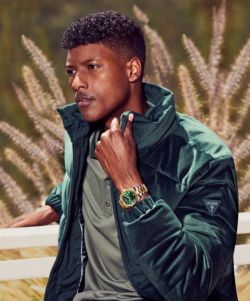 For the true connoisseur, this sporty dress watch from GUESS is a must-have style. A 42mm stainless steel case with coin-edge top-ring in gold-tone is paired back with an opulent green sunray dial and gold two-tone stainless steel bracelet. Perfect for the office or a night on the town.