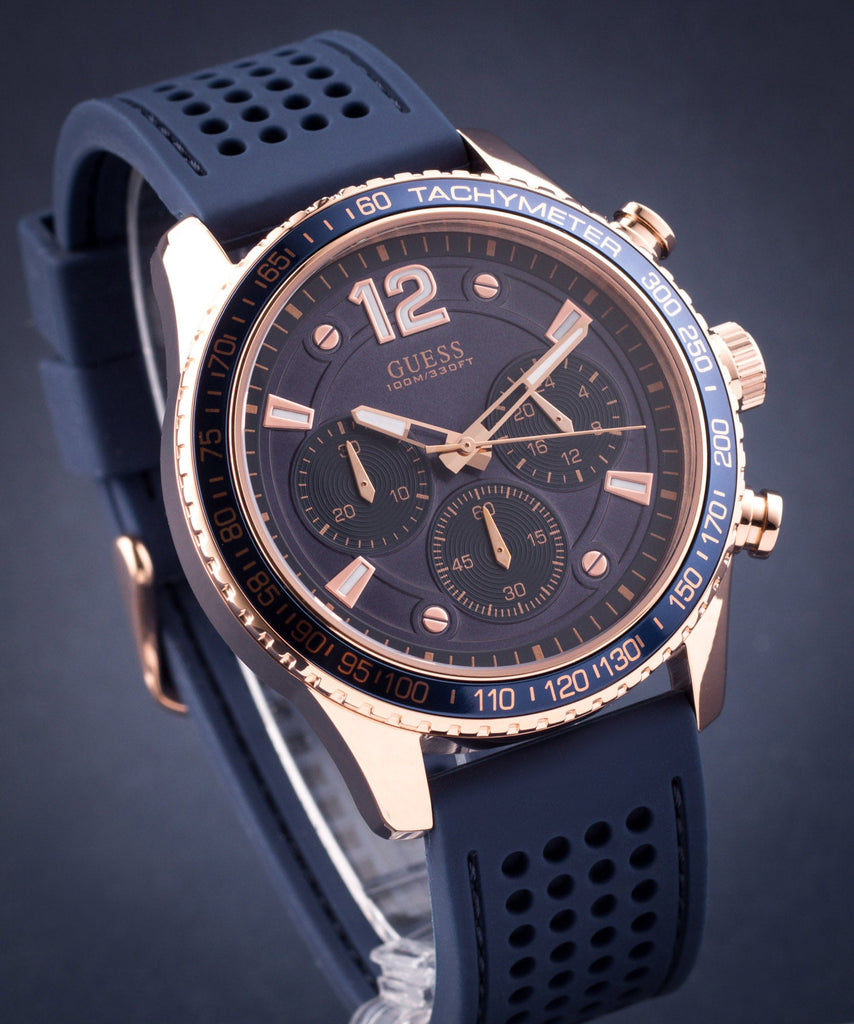 Dial Type: Analog. Luminescent hands. Chronograph – three sub-dials displaying: 60 second, 30 minute and 24 hour. Quartz movement. Scratch resistant mineral crystal. Pull / push crown. Solid case back. Round case shape. Case size: 44 mm. Case thickness: 12 mm. Band width: 20 mm. Tang clasp. Water resistant at 100 meters / 330 feet. Functions: chronograph, tachymeter, hour, minute, second. Sport watch style. Guess Fleet Chronograph Blue Dial Gents Watch W0971G3.