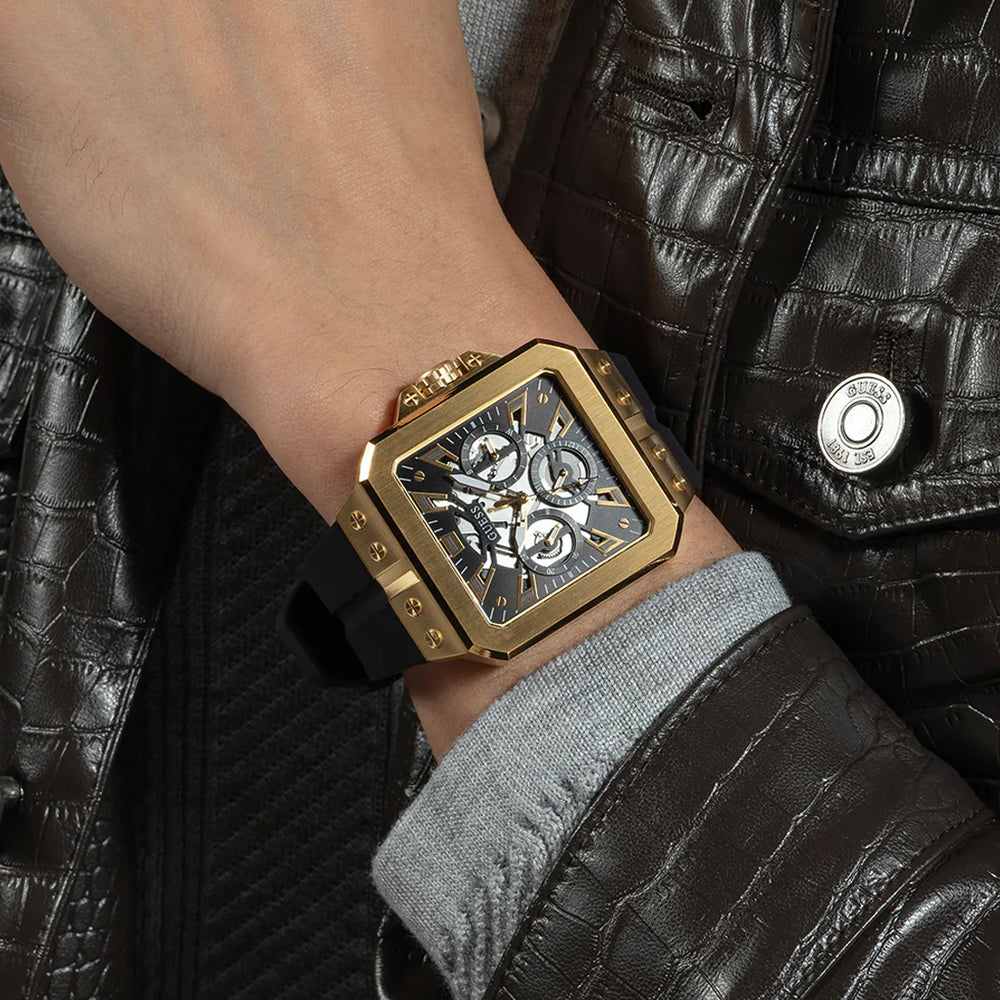 Amaze everyone around you by wearing this men's analog watch from Guess. The black square dial is protected by a mineral glass. It features multifunction and a crown for time adjustment. The silicon strap comes in a black hue that further elevates the look of the timekeeper. Besides, it is completed with a buckle clasp to ensure a secure fit on the wrist.