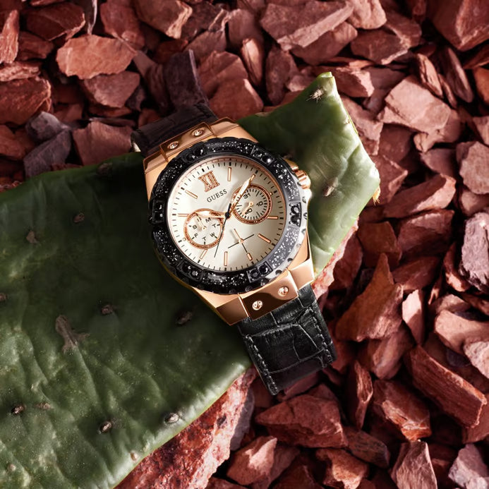 Guess ladies sport steel watch W0775L9 ladies black Guess watch. This watch has a black leather strap and a stainless steel buckle for closure. The dial case is rose gold and features glitter detailing around the dial face. The dial face is white and the hour marks are rose gold, represented by roman numerals. The hour hands are rose gold. This watch is very casual and can be worn with everyday outfits to add a bit of sparkle. Approximate measurements: case width: 39mm case depth: 11mm