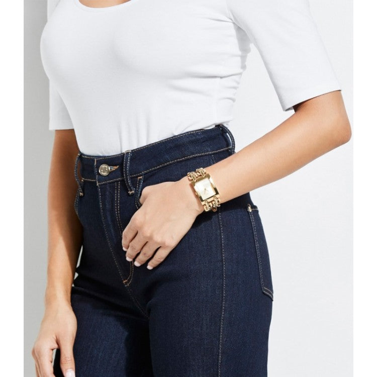 Scratch resistant mineral crystal. Pull / push crown. Solid case back. Square case shape. Case dimensions: 30 mm x 39 mm. Case thickness: 9 mm. Band width: 25 mm. G-link clasp. Water resistant at 30 meters / 100 feet. Functions: hour, minute. Dress watch style. Guess Mod Quartz Champagne Dial Ladies Watch W1117L2.