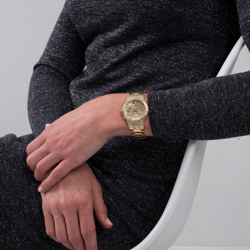 Guess Moonlight Multi Function Diamonds Gold Dial Gold Steel Strap Watch for Women - GW0320L2