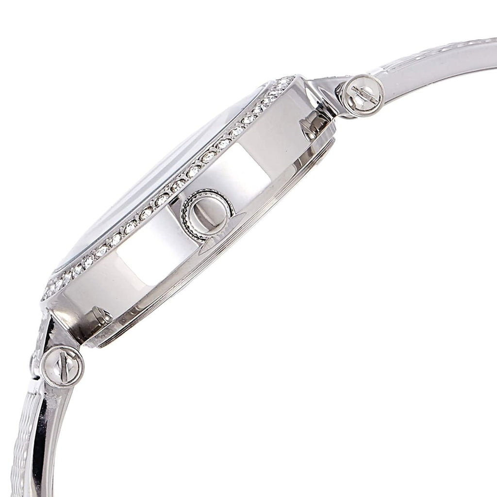Silver-tone stainless steel and crystal set case with a silver-tone stainless steel bracelet. Fixed silver-tone crystal set bezel. Silver-tone dial with silver-tone hands and crystal set index hour markers. Crystal set minute scale around the inner rim. Dial Type: Analog. Quartz movement. Scratch resistant mineral crystal. Pull / push crown.