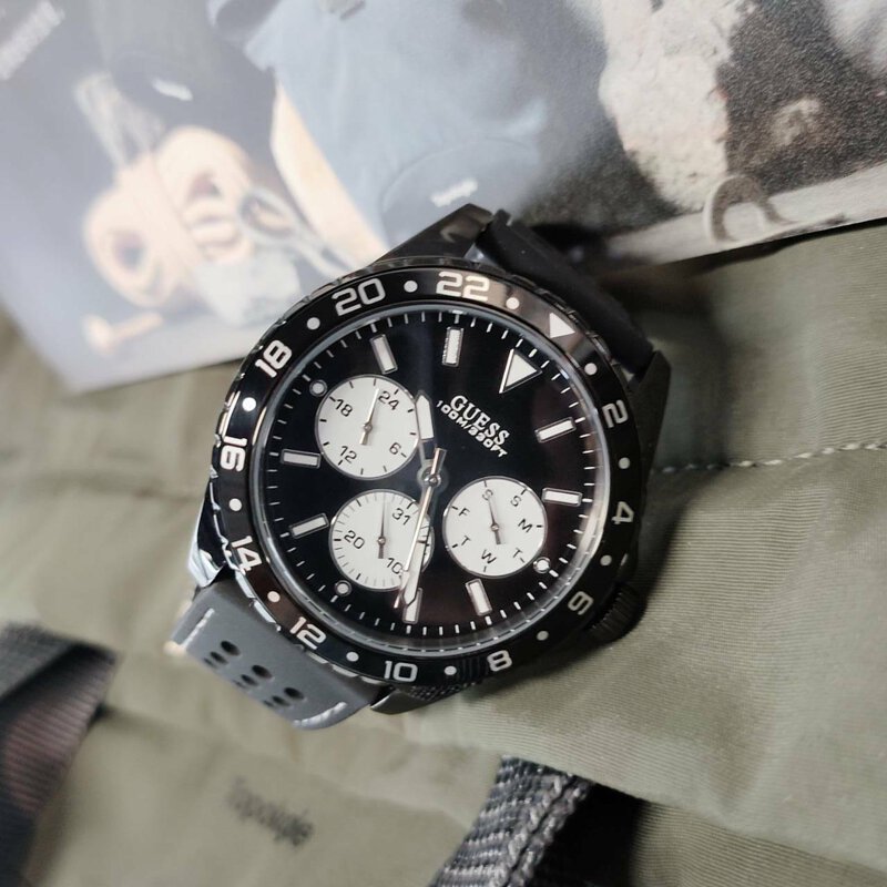 Black stainless steel case with a black rubber strap. Uni-directional rotating black stainless steel bezel. Black dial with luminous silver-tone hands and index hour markers. Minute markers around the outer rim. Dial Type: Analog. Luminescent hands and markers. Date display at the 6 o’clock position. Three white multi-function sub-dials displaying: date, day of the week, and 24 hours.