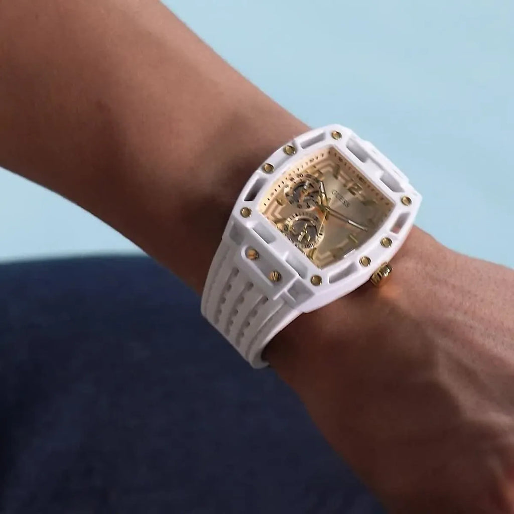 Guess Champagne Dial Men Analog Watch - Dial Color : Champagne, Case Material: Polycarbonate, Case Shape: Rectangle, Water Resistance: 50 m, Case Width: 41 mm, Strap width: 28 mm, Case Thickness: 12.65 mm, Case Color: White, Strap Material: Silicone, Strap Color: White