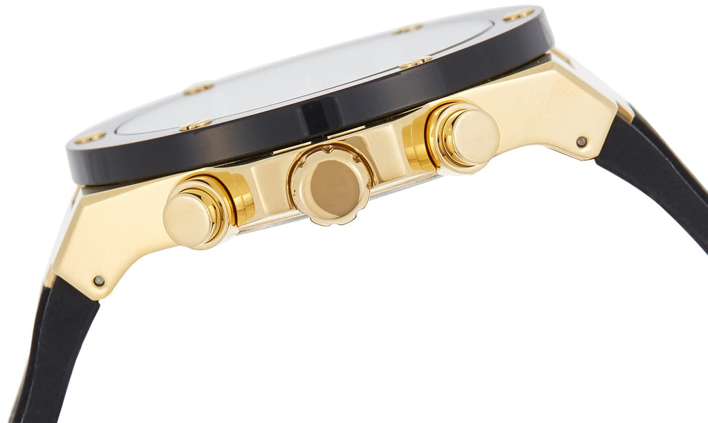A bold hyperactive style that will definitely make an impact. This timepiece features a chrono-look multi-function dial with a gold case and black nylon top ring complete with screw detailing.