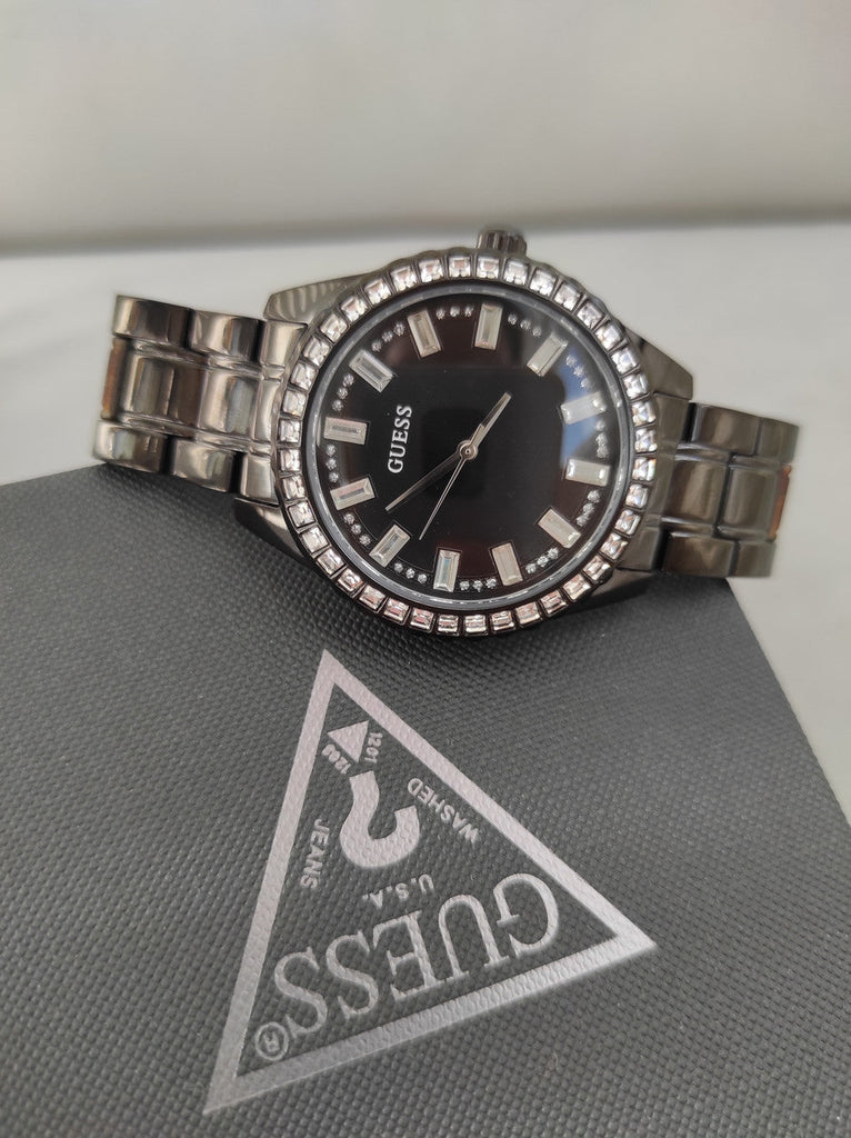Watches from the Guess collection. A model with a round dial and a decorative band with jewelry.