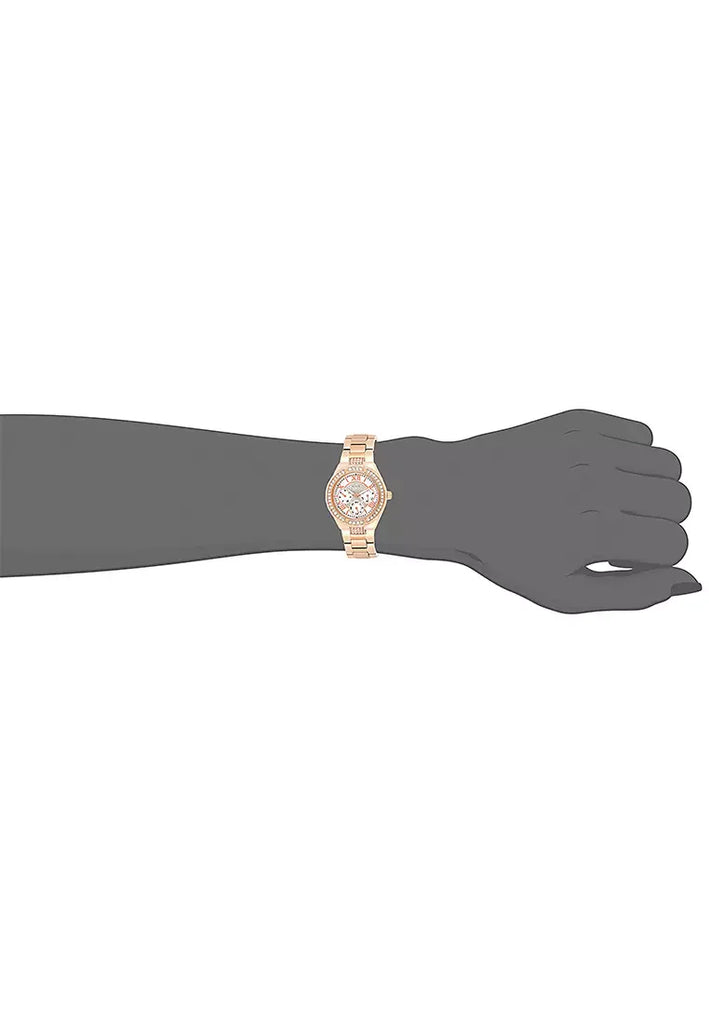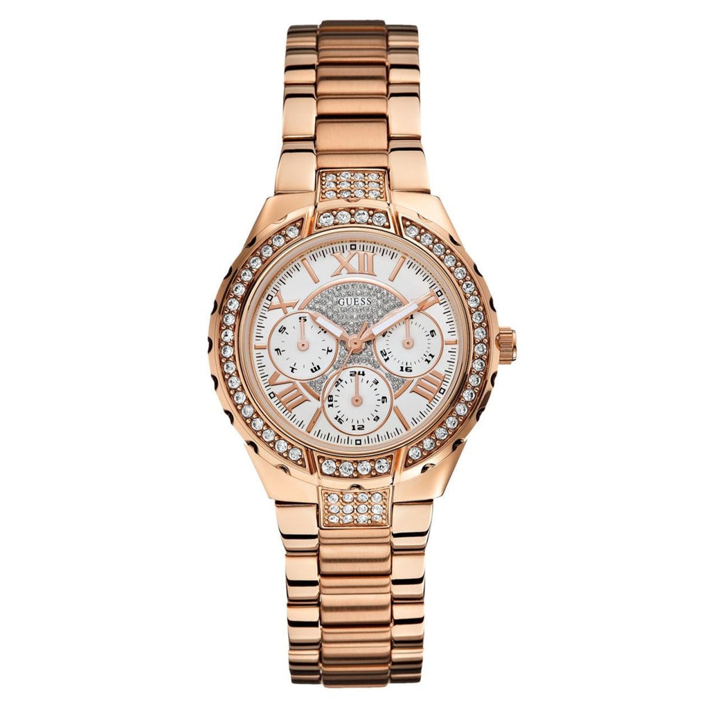This ladies Guess watch, features a rose PVD gold plated polished case with a white sunray multi-function dial and a rose gold tone brushed/polished stainless steel bracelet that fastens with a pilot buckle. This watch is also powered by a quartz movement.