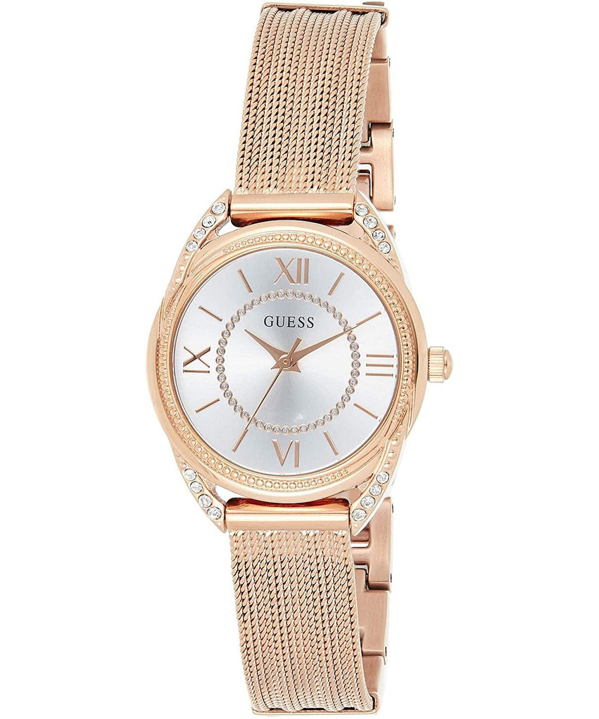 GUESS Ladies watch featuring a polished rose gold case with crystal detailing, sunray silver dial and polished rose gold mesh bracelet with adjustable G-Links.