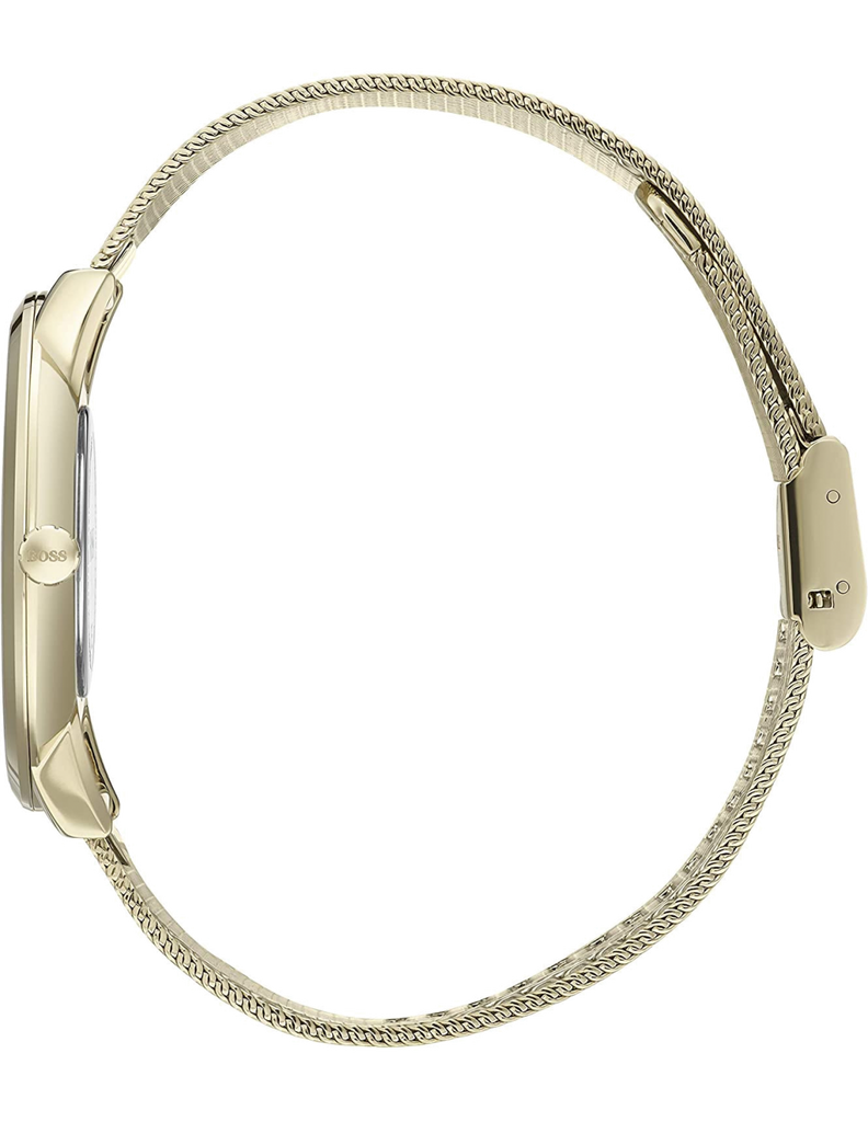 This Hugo Boss watch has a gold coated stainless steel case 40mm in diameter and is fitted with a metal strap. Inside the case lies a movement and the watch features a mineral crystal. Butterfly clasp with push buttons, water resistance upto 30 meters.