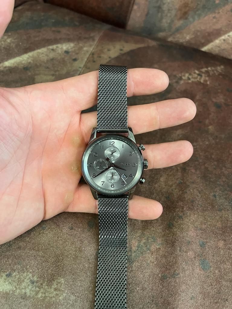 A modern and understated watch by BOSS, crafted in stainless steel with grey plating. Designed with a tonal dial for a discreet look, this elegant watch is inspired by the compass with multi-functional sub eyes for straightforward navigation in all conditions. The mesh strap strikes a masculine note, while logo detailing at the clasp provides a signature finish to this refined watch.