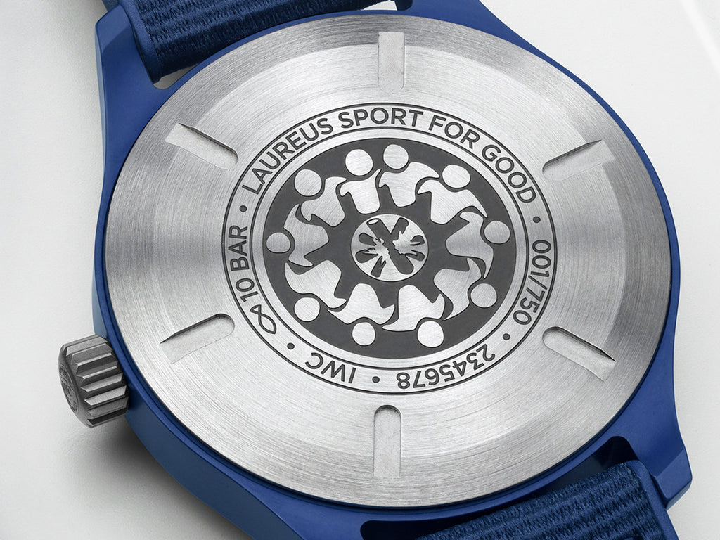 IWC Pilot’s Watch Edition “Laureus Sport for Good”, with automatic movement, features 41 mm ceramic case with a blue dial and a blue rubber strap.