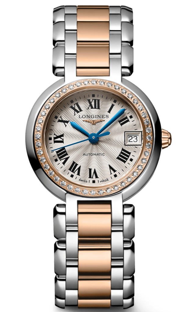 Women's elegant Longines watches from the Primaluna series. Drive: Automatic Swiss movement Longines L595 (28,800 vibrations per hour, 40 hours power reserve). Made of stainless steel 316L in combination with rose gold plating. Case diameter 26.5 mm. Dial color silver. Date window at position "3". Bezel set with 299 diamonds 0.403 ct. Sapphire glass with double anti-reflective coating. Water resistance 30 m. Stainless steel movement with butterfly clasp.