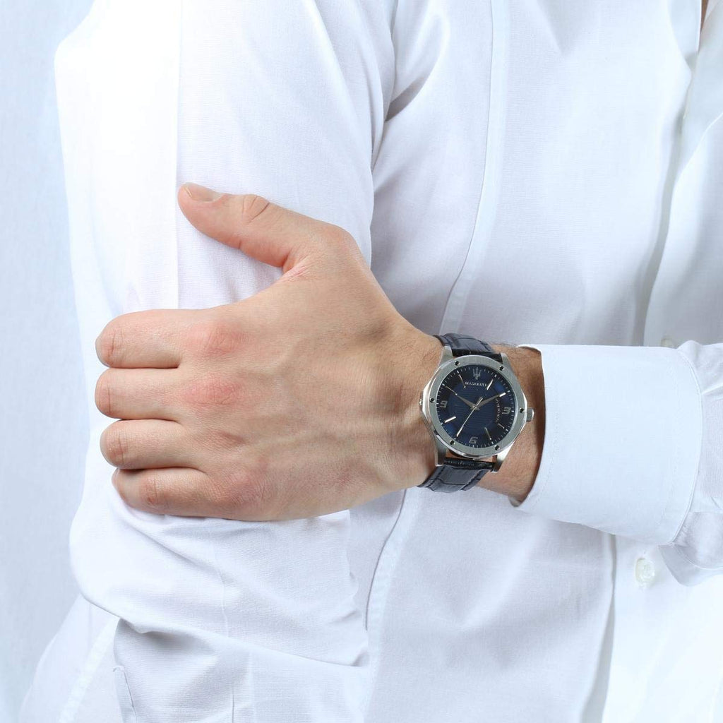 Silver-tone stainless steel case with a blue leather strap. Fixed silver-tone stainless steel bezel. Blue dial with silver-tone hands and Arabic numeral and index hour markers. Minute markers around the outer rim. Dial Type: Analog. Date display at the 3 o'clock position. Quartz movement. Scratch resistant mineral crystal. Screw down crown. Solid case back. Round case shape, case size: 42 mm, case thickness: 9.5 mm. Band width: 18 mm. Buckle clasp. Water resistant at 100 meters / 330 feet. Functions: date, hour, minute, second. Casual watch style. Maserati Circuito Blue Dial Men's Watch R8851127003.