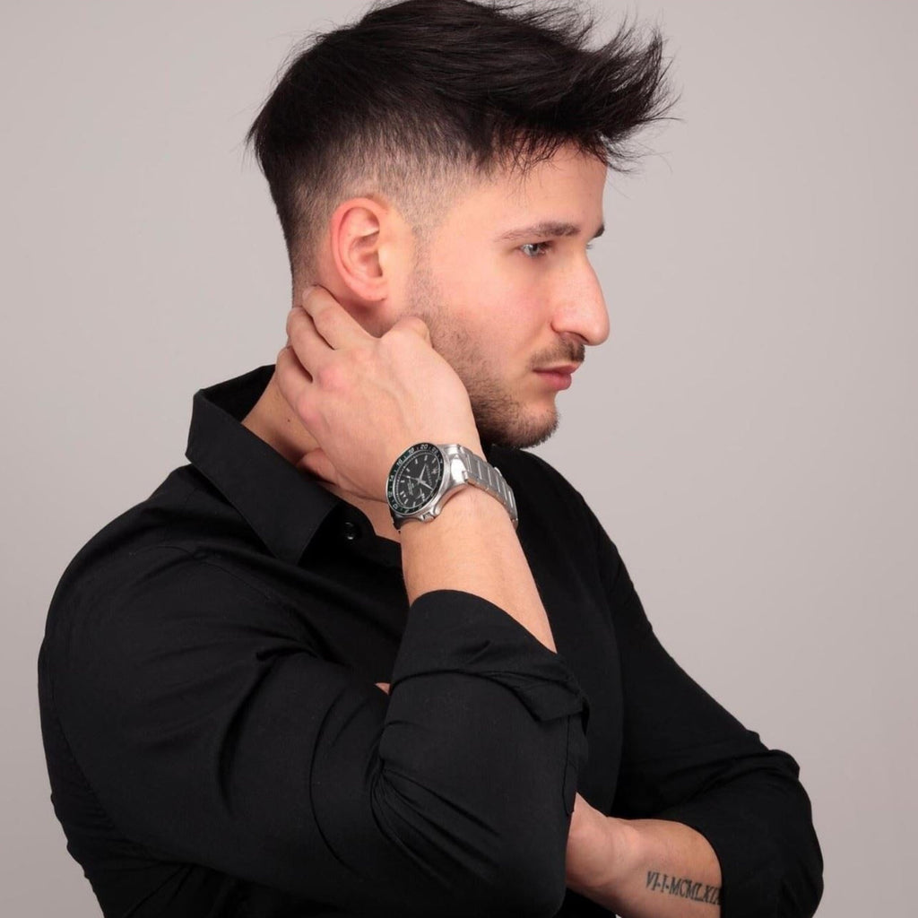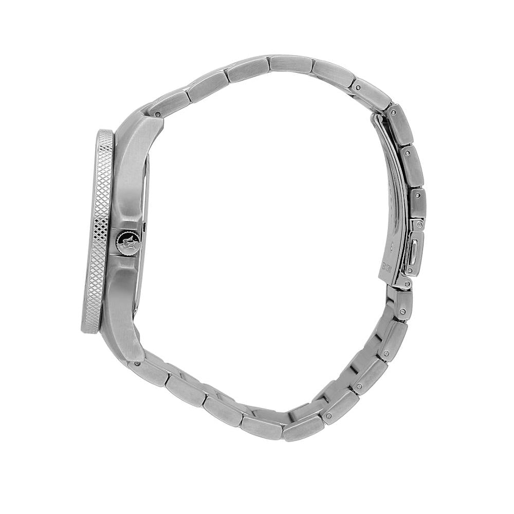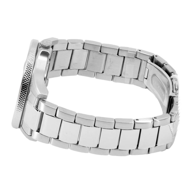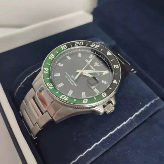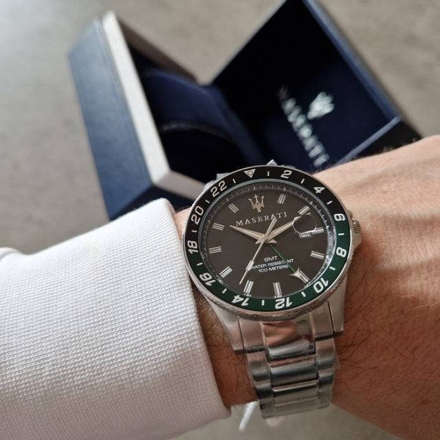 The Maserati Sfidia R8853140005 is housed in a stainless steel case that measures 44mm in width and 11.2mm in depth. The case boasts a two-tone ‘Sprite’ fixed bezel that exhibits a 24-hour GMT scale that allows the wearer to track a second time zone simultaneously. It works by allowing you to set a reference time on the bezel, and you can then use the watch’s hands or other markers to read the time in the second time zone. The walls of the bezel have a coined edge finish.