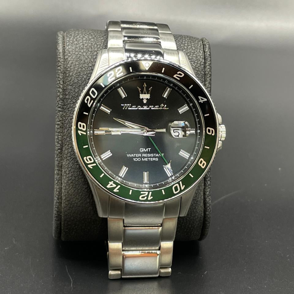 The watch is complemented by a 3-link style stainless steel bracelet. The outer links feature a brushed finish, providing a distinctive texture, while the inner links boast a polished surface, adding a touch of sophistication. The bracelet securely fastens around the wrist using a deployment clasp signed with the Maserati logo.