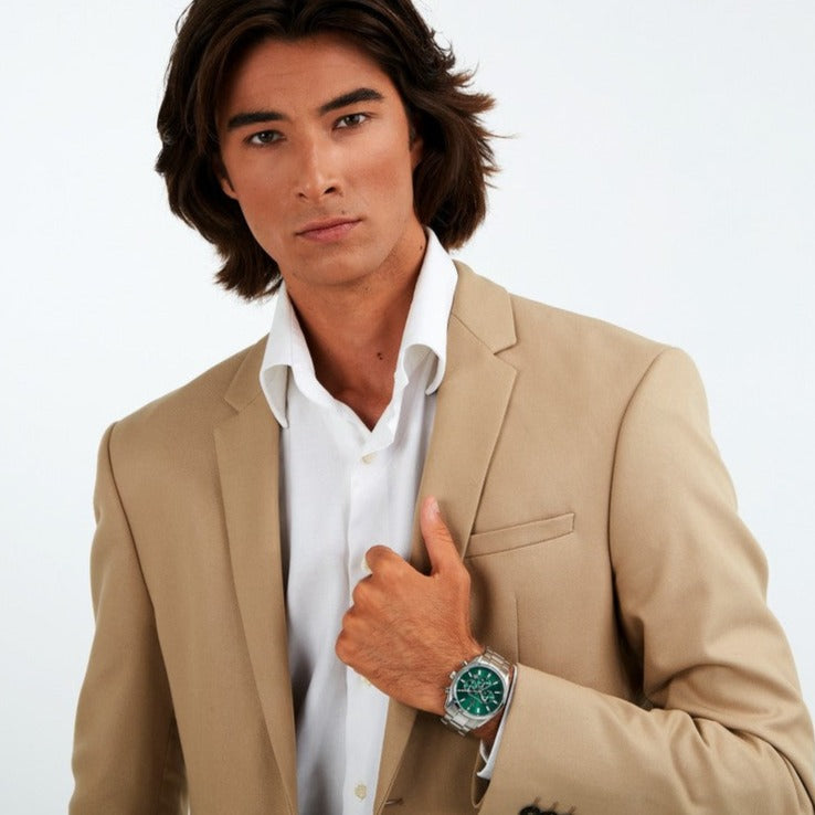 Men's watch with a diameter of 44mm with a Quartz precision chronograph mechanism. It has a green dial with gold-plated hands and details and a date display. Its case is made of stainless steel with a specially hardened mineral crystal. It has a stainless steel bracelet and safety clasp. It is waterproof (5 ATM).