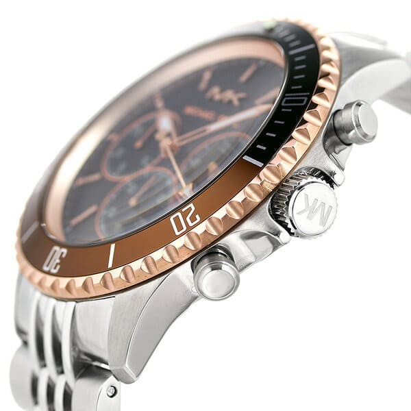 Michael Kors Men's Bayville 44x50mm watch features a black sunray dial with silver-tone stick indexes and numerals, chronograph movement and Steel bracelet.