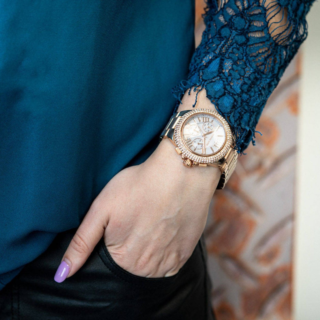 The Michael Kors Ladies Camille Watch MK6995 combines a 43mm round shaped stainless steel case, a sparkling stone set bezel and a rose gold tone stainless steel bracelet with a push button deployment clasp.