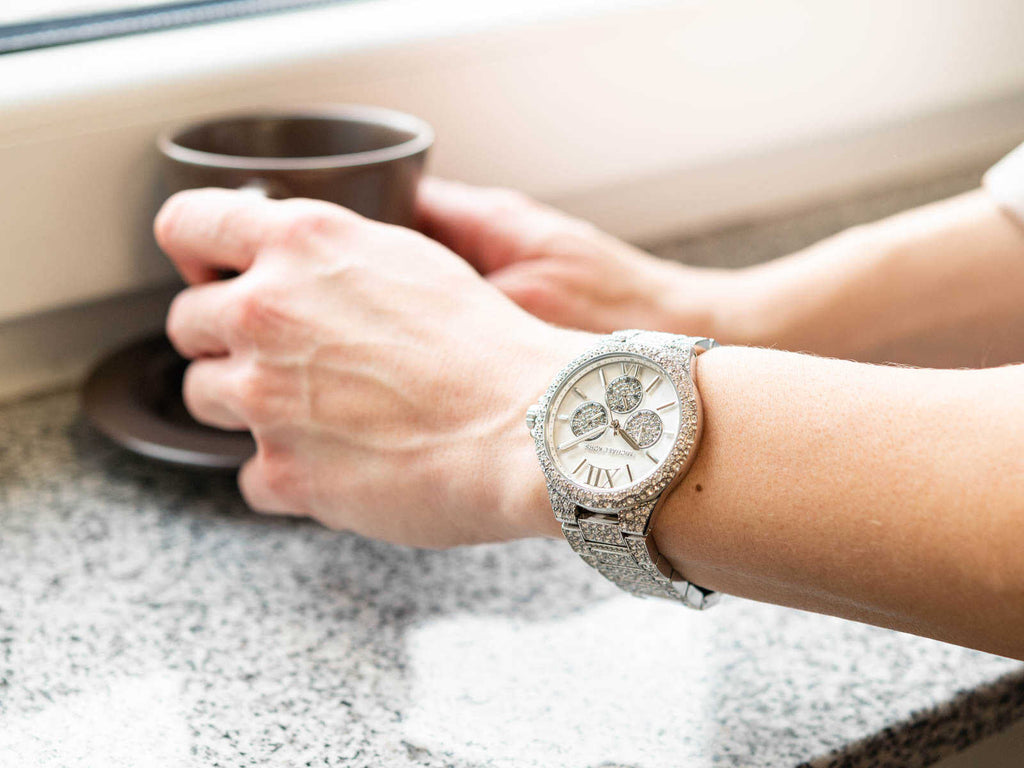 Michael Kors' Camille 42mm watch features a pearlized white dial with silver-tone stick indexes, silver-tone stingray pave case and topring, multifunction movement and stingray pave stainless steel bracelet.