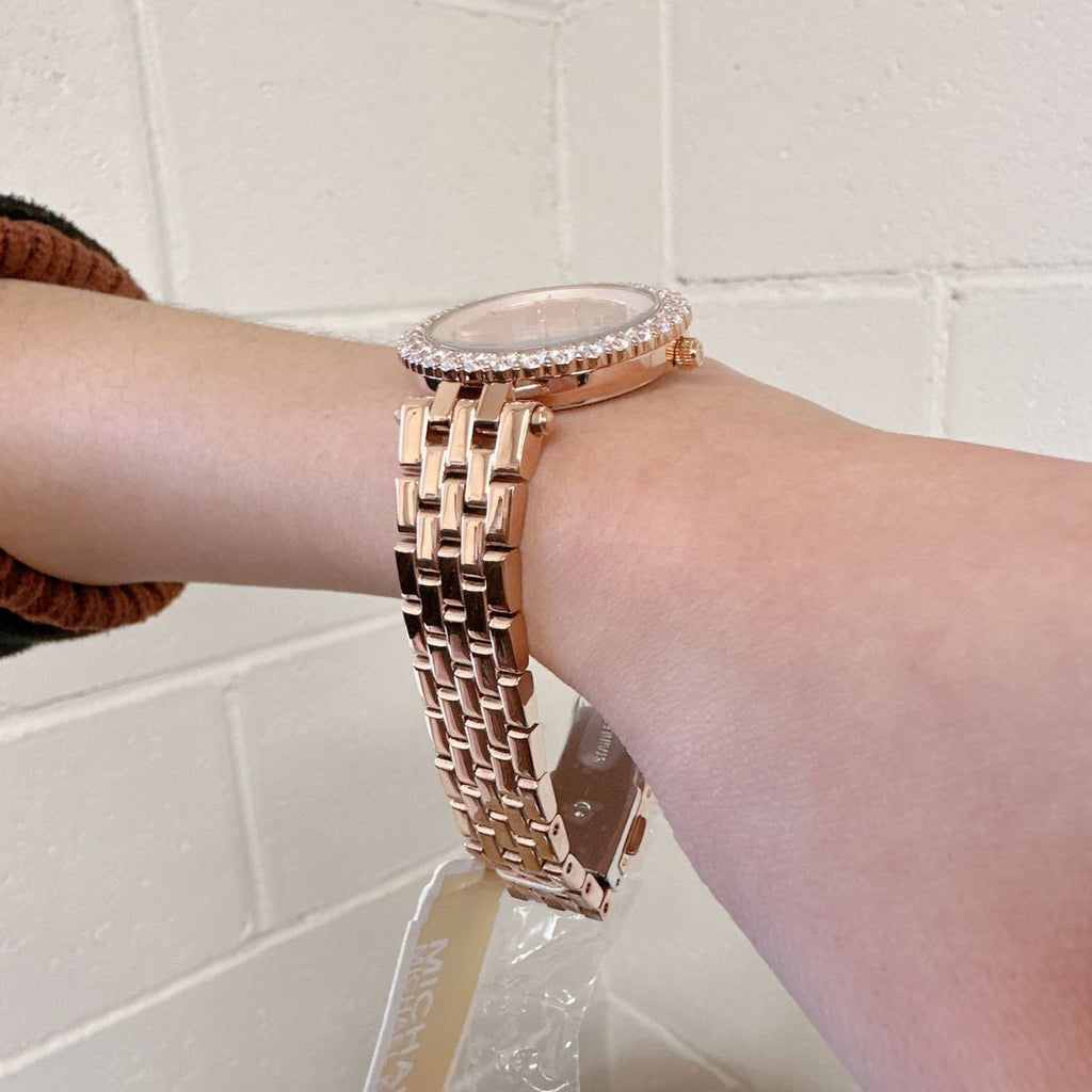 Elevate your look with the Michael Kors, a glamorous analog watch accented with rose-gold tone. A pavé-embellished bezel lends look-at-me flair, while the radiant rose-gold-tone five-link bracelet strap renders this timepiece exceptionally elegant. It is a refine addition to your everyday look.