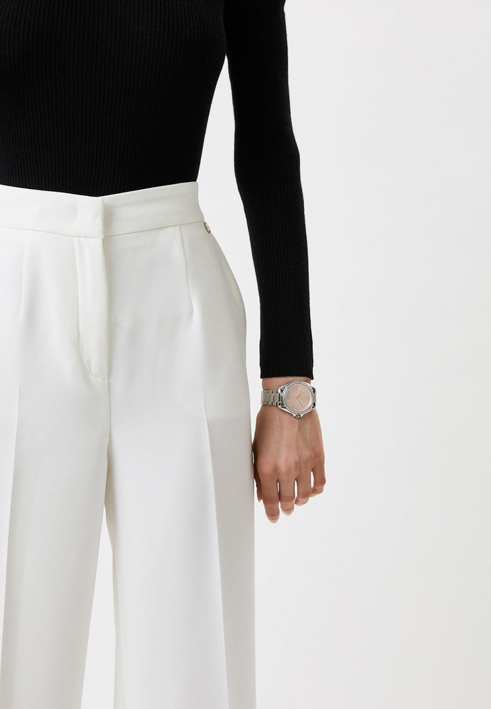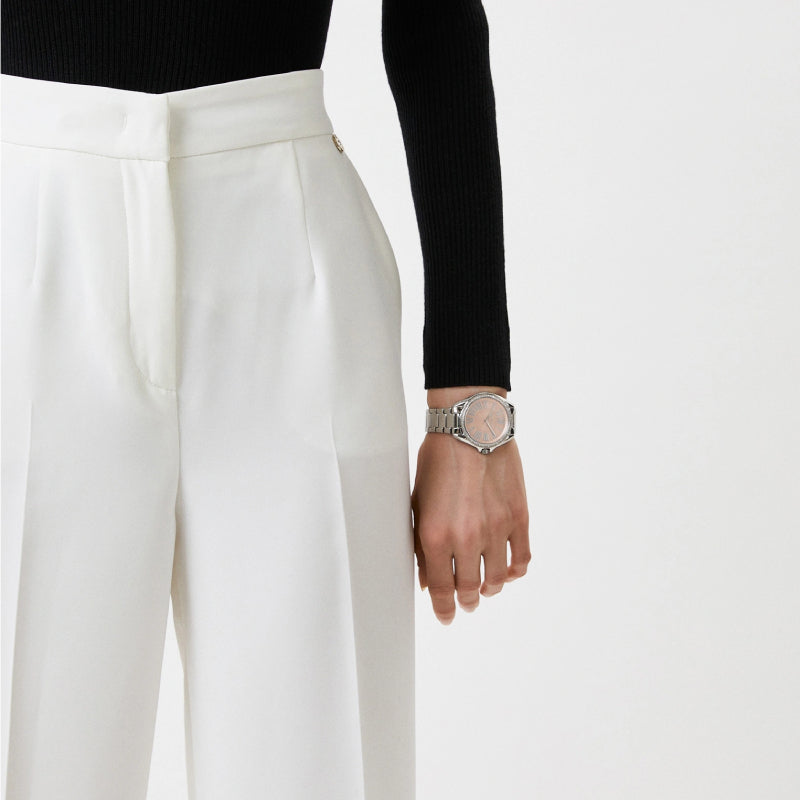 • Round stainless steel case, with a pink dial